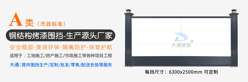 深圳市大通建材公司專業(yè)從事烤漆板鋼結(jié)構(gòu)圍擋、鍍鋅板鋼結(jié)構(gòu)圍擋、PVC板圍擋等集工程圍擋承接、施工一體的深圳鋼結(jié)構(gòu)圍擋生產(chǎn)廠家,為各施工單位提供烤漆板鋼結(jié)構(gòu)圍擋、鍍鋅板鋼結(jié)構(gòu)圍擋、PVC板圍擋等施工圍擋的生產(chǎn)批發(fā)與施工服務(wù),咨詢電話:13826562448