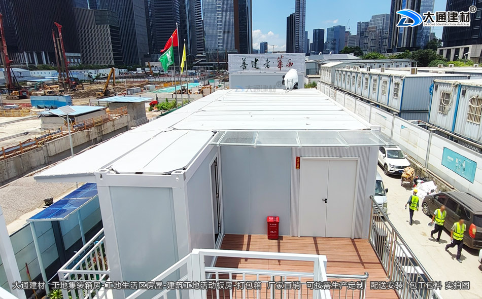在深鐵前海國際樞紐中心T7土石方、基坑支護及樁基工程項目的工地生活區房屋,選用的是深圳市大通建材生產銷售的工地集裝箱房。此項目工程的工地生活區箱房最基礎的,是作為工人宿舍使用。經過改造的集裝箱房,內部配備上下鋪床位,安裝了門窗、照明設施和通風設備,有的還配備了空調。原本冰冷的鋼鐵箱體,被劃分成一個個溫馨的居住單元,為辛苦勞作一天的工人提供遮風擋雨、休息安睡的場所,同時配有廚房、雜物間、洗手間等。為了提升居住體驗,此工地還在集裝箱房外搭建遮陽棚、洗漱區等配套設施,讓工人在忙碌的工作之余感受到生活的便利。