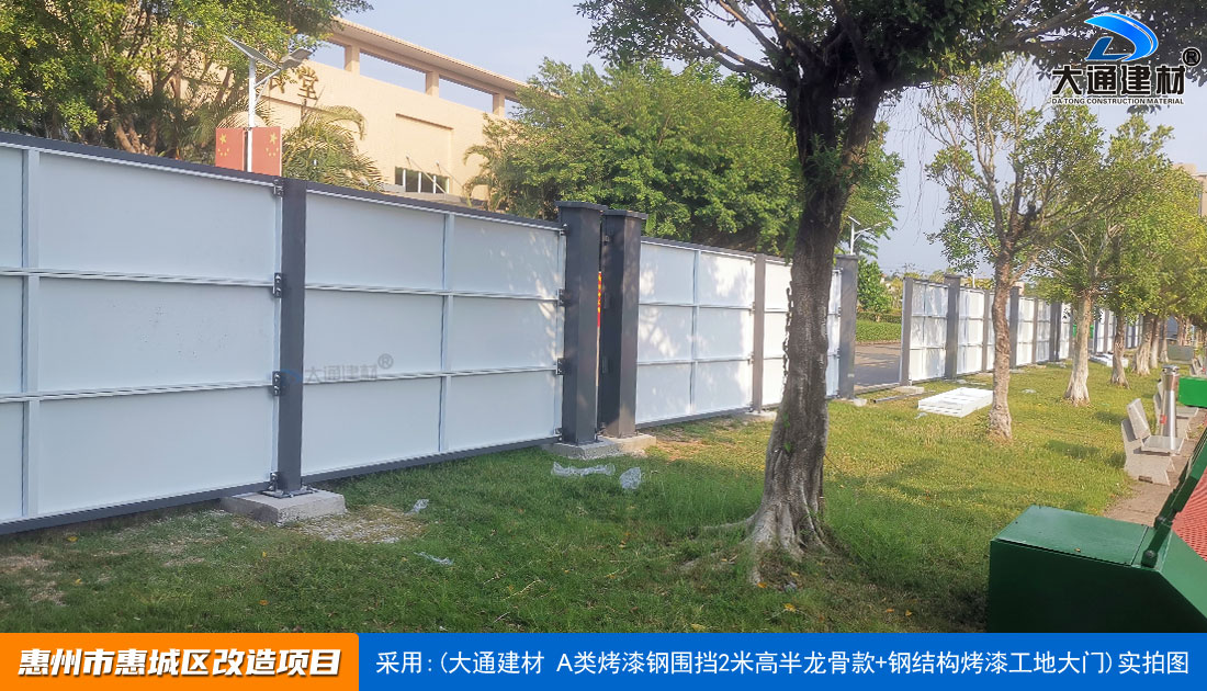 建設工程施工工地四周應按規定設置連續、密閉的鋼結構施工圍擋,建造多層、高層建筑的還應設置安全防護設施。在市區主要路段和市容景觀道路及市場、機場、碼頭、車站廣場等人流量、車流量比較多的地方設置的施工圍擋的高度不得低于2.5m,在其它路段設置的圍擋的高度不得低于1.8m。而深圳市大通建材A類鋼圍擋烤漆半/無龍骨款的標準高度是2.5米、長度為6.3米一擋,而圍擋高度特殊需求的如3/米/4/米/5米/6/米等高度的可以進行定制化生產。