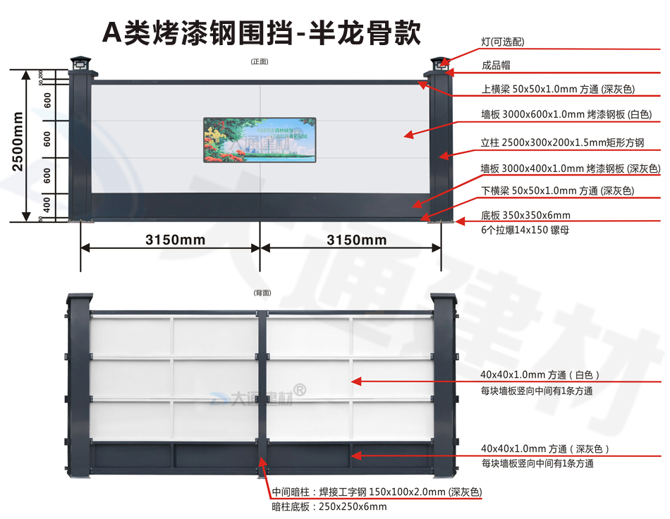 大通建材A類鋼結構烤漆圍擋半/無龍骨款適用于市政建設施工、房地產項目施工、地鐵項目施工、管網改造、小區改造、城市建設、道路施工等工程使用